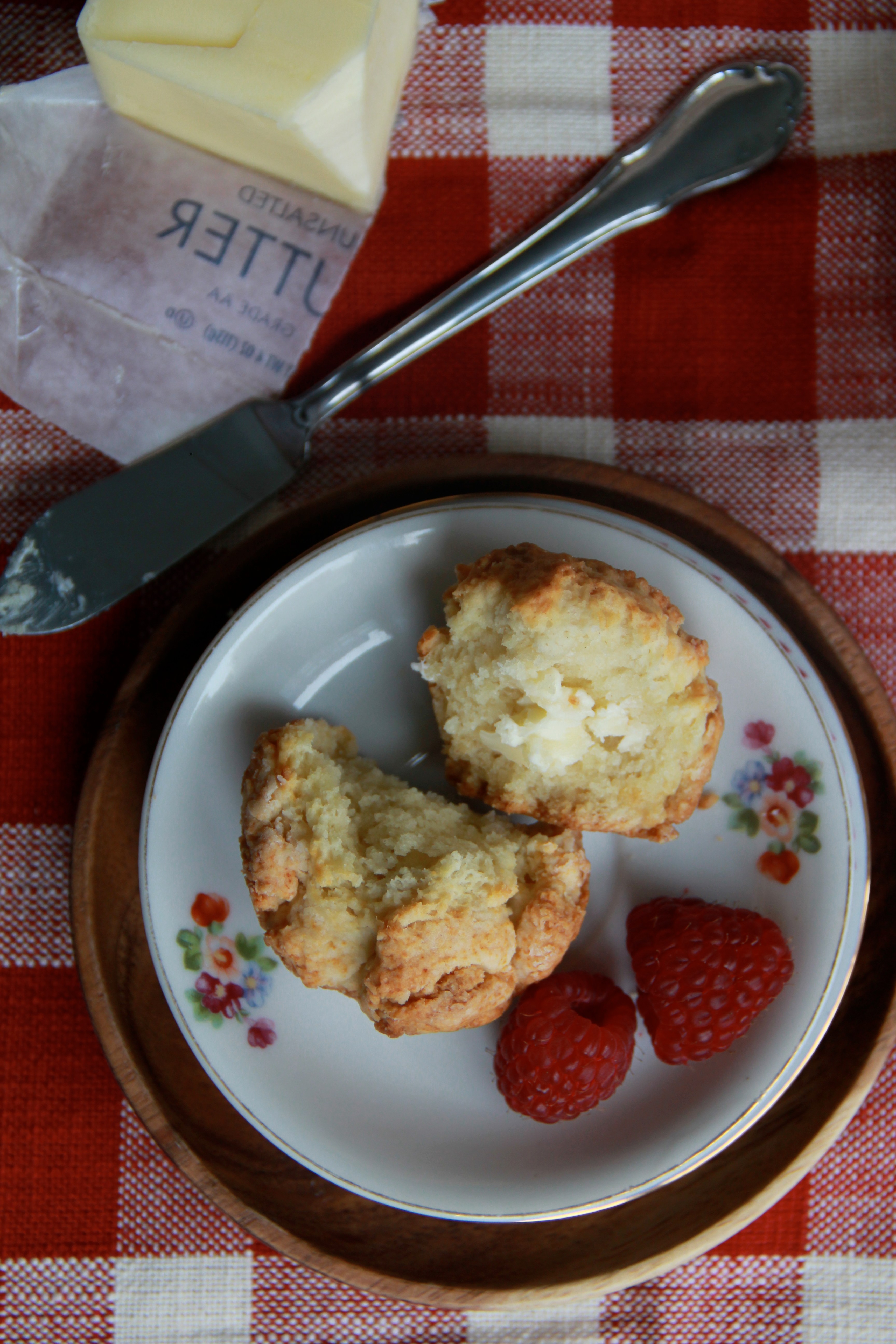 Sometimes you just need a biscuit. A warm and sweetish salty one, smeared with soft butter and jam, and maybe some fruit and milky tea.
